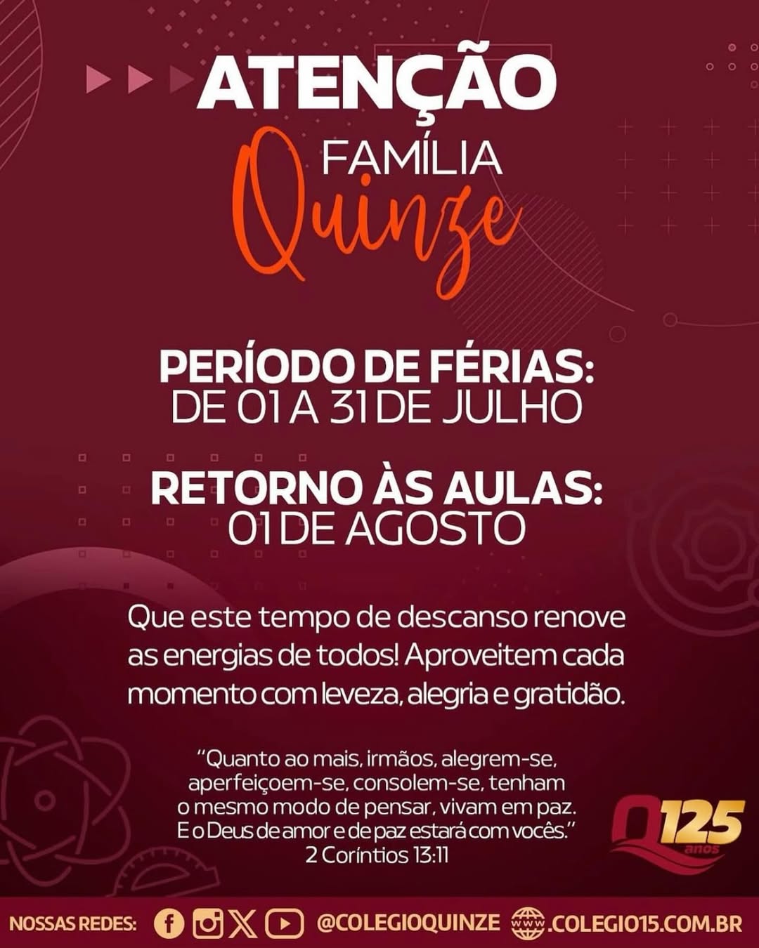 Aproveitem esse tempo de descanso com sabedoria e coração tranquilo. Em agosto, nos reencontramos para seguir aprendendo e crescendo juntos, se Deus quiser! 🙏