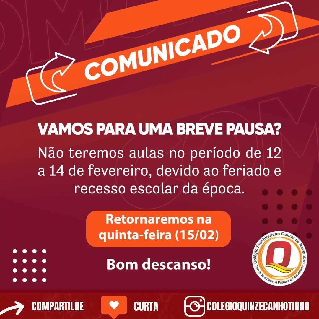 Não teremos aulas no período de 12 a 14 de fevereiro, devido ao feriado e recesso escolar da época.